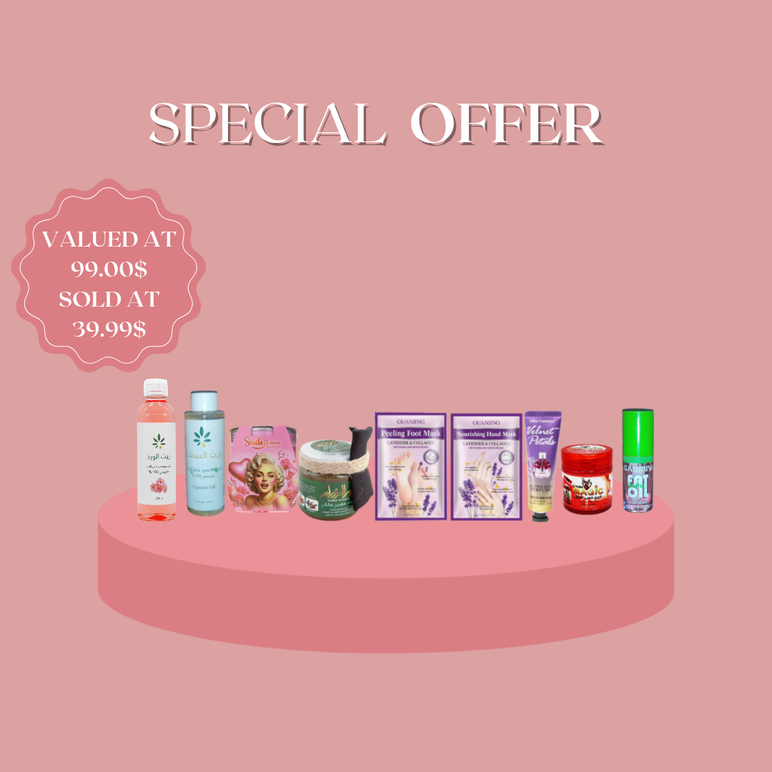 Rose Oil 250 ml Saad Oil Hair Removal 100ml زيت السعد Natural 100% + Bikini 👙 Butter Smile Heaven + Moroccan Scrub & Loofa + Foot & Hand Mask + Free Magic Foot & Hand Cream + Lip Oil ( Random ) ©